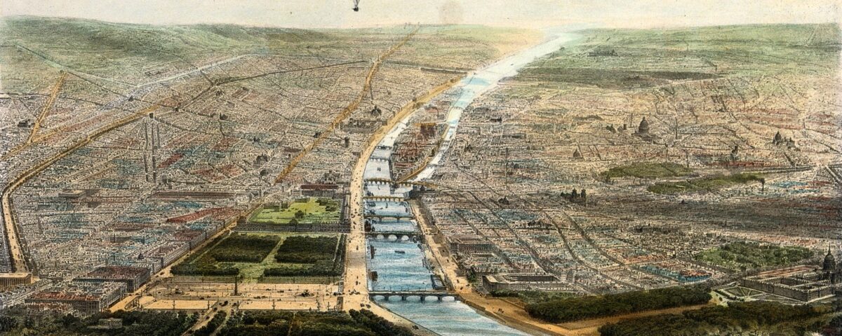 A hot-air balloon travels over part of Paris by Jules Arnout. Wellcome Images via Wikimedia Commons is licensed under CC BY 4.0.